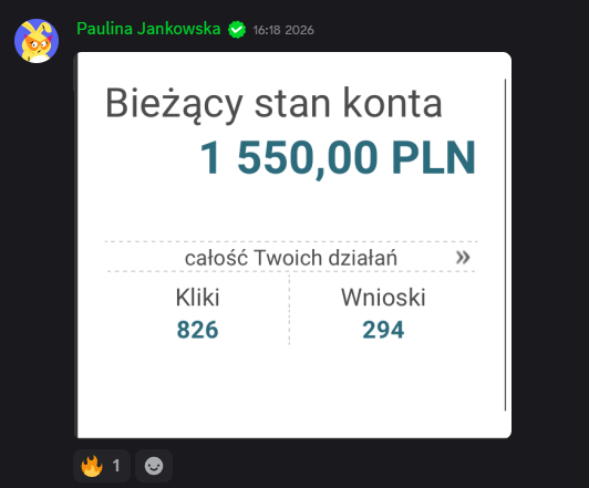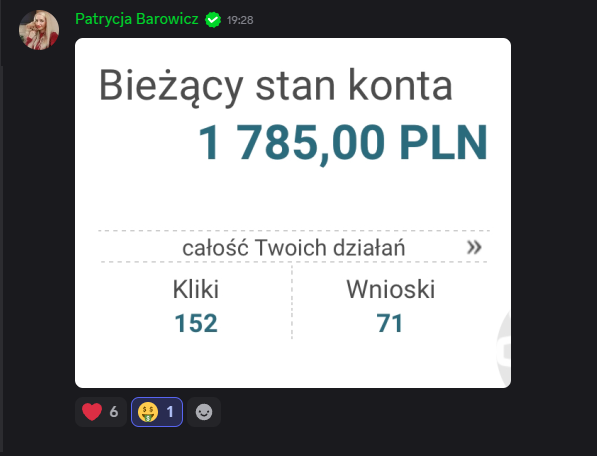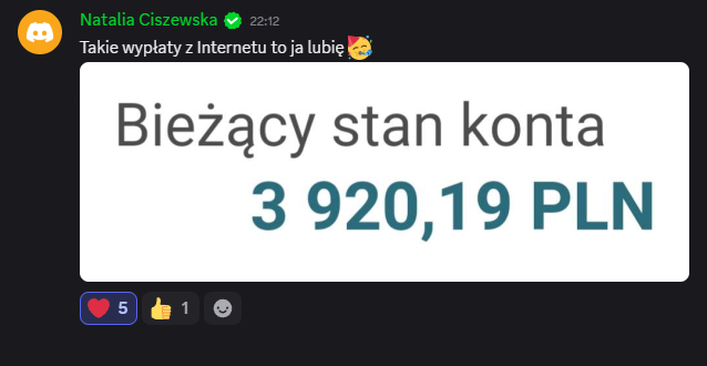 Polecam każdemu dołączyć i przekonać się na własnej skórze. Ja jestem tutaj od 2021 roku i jestem idealnym przykładem, że można łączyć pracę na etacie z zarabianiem online Cieszę się, że mogę tutaj być, ponieważ tworzymy świetną społeczność, gdzie zawsze jest przyjazna atmosfera pomocni ludzi